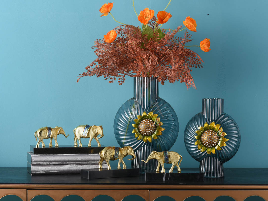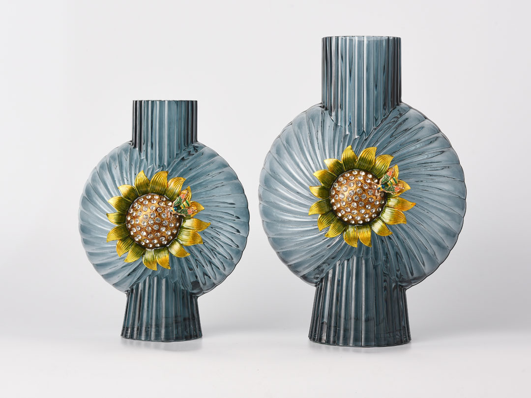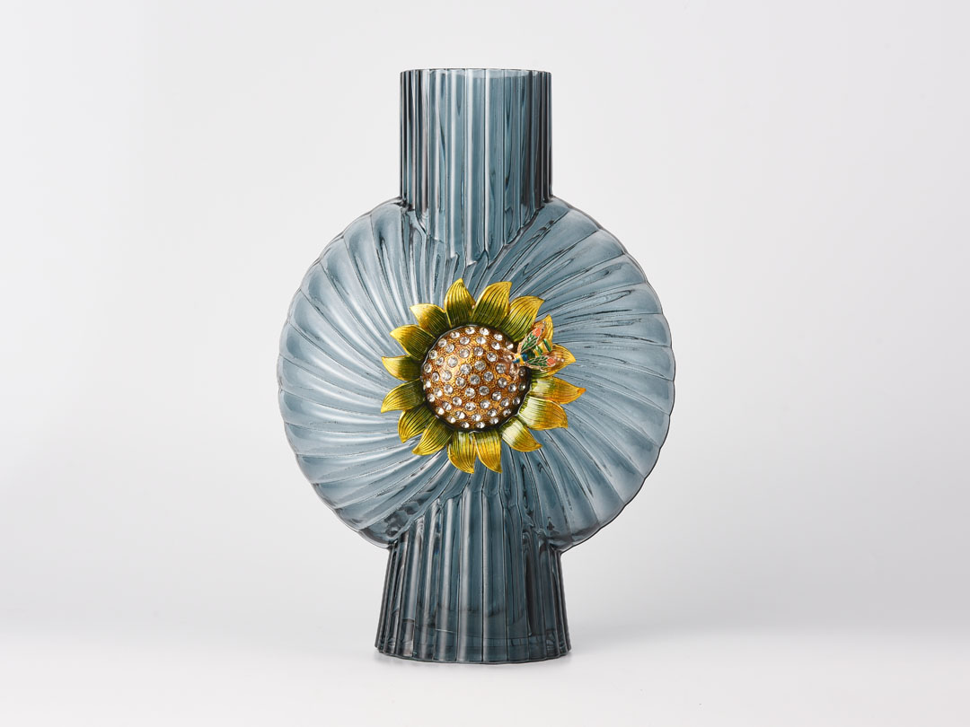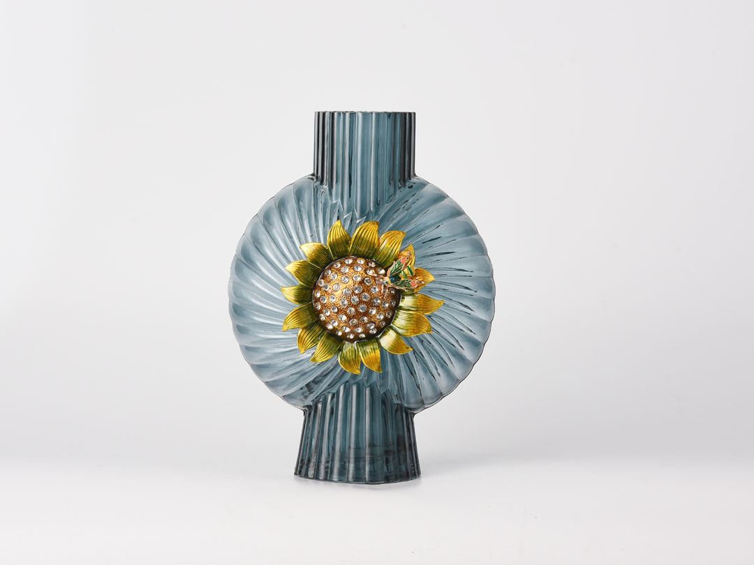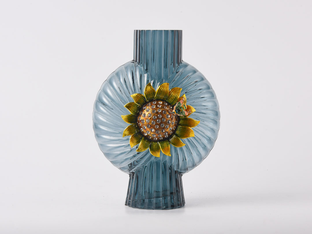 | Име | Декор од сина стаклена вазна со декорација од сончоглед | Тип | Стаклена вазна за домашен декор |