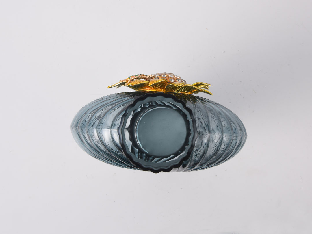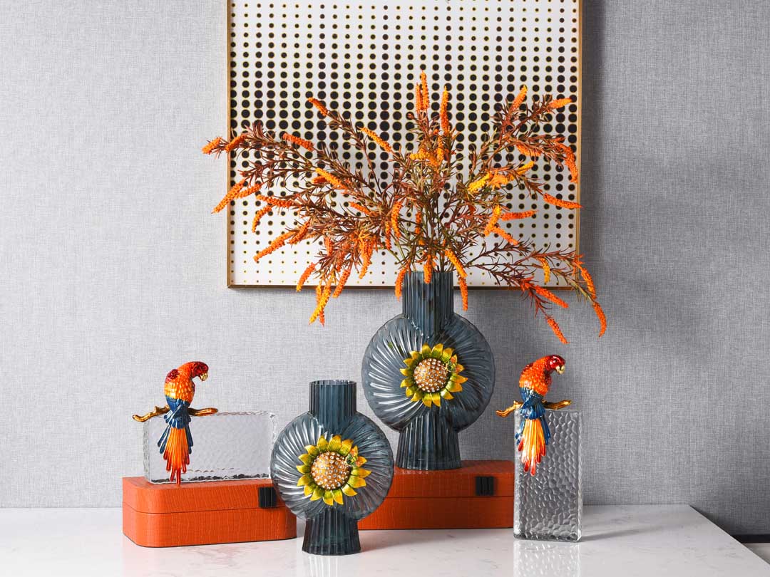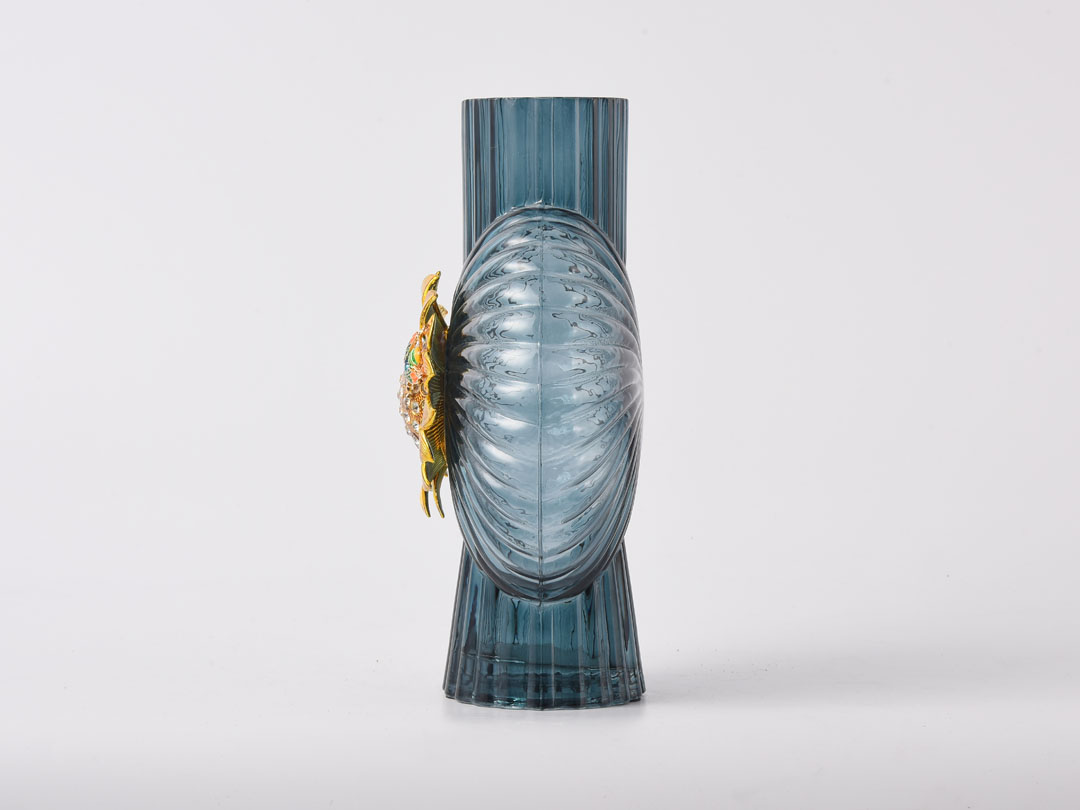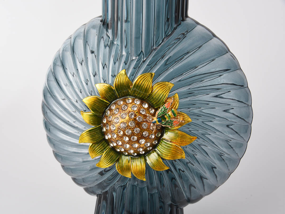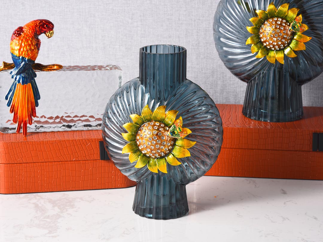 Сината, што претставува вода, ја содржи моќта на морето; âзлатниот сончоглед, синоним за лојалност и храброст.â Висококвалитетниот декор од сина стаклена вазна Rundecor со сончогледова декорација, прекрасна стаклена вазна налик на океан, украсена со елабориран рачно насликан емајл и луксузна дијамантска влошка, која носи неспоредливо искуство на перцепција.