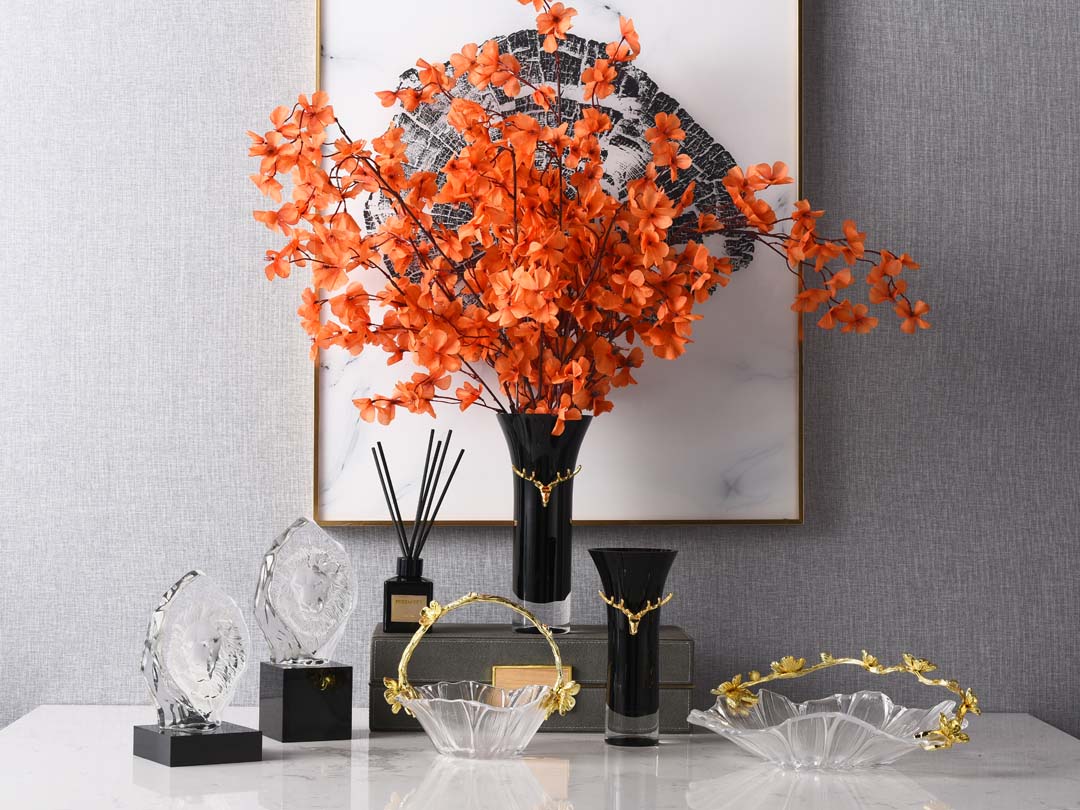 Висококвалитетниот стаклен сад за овошје Rundecor со метални златни цветови дава исклучителен живот, прекрасно искуство на бодрост и елеганција.