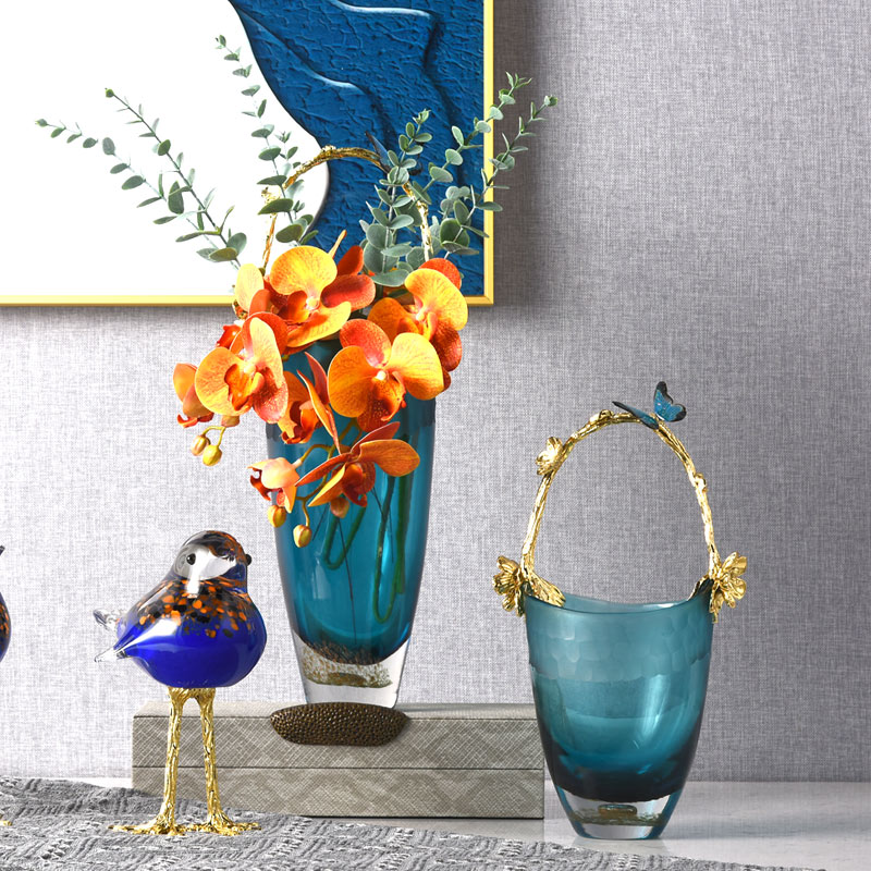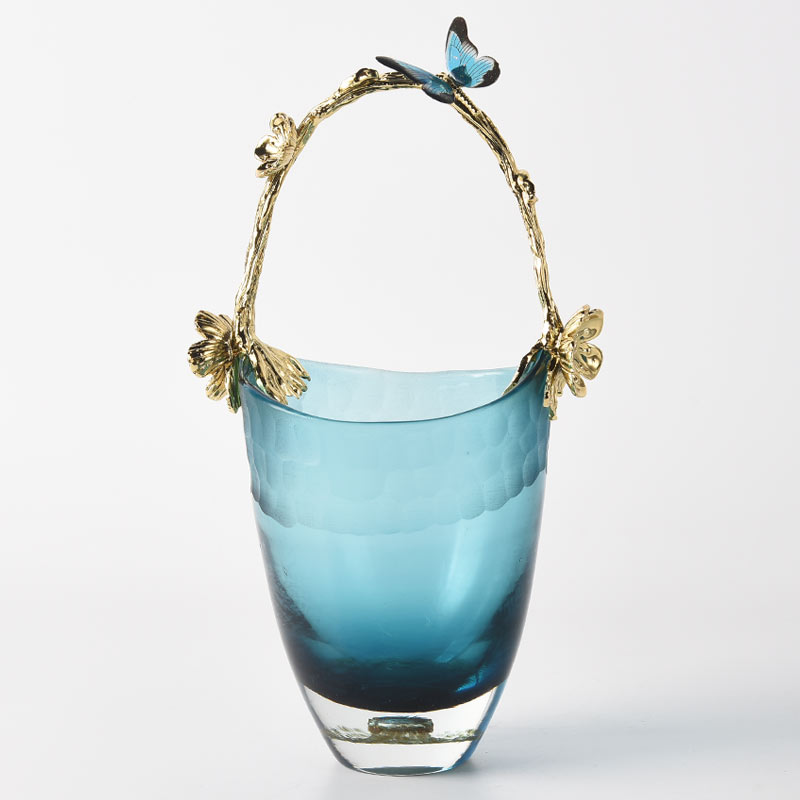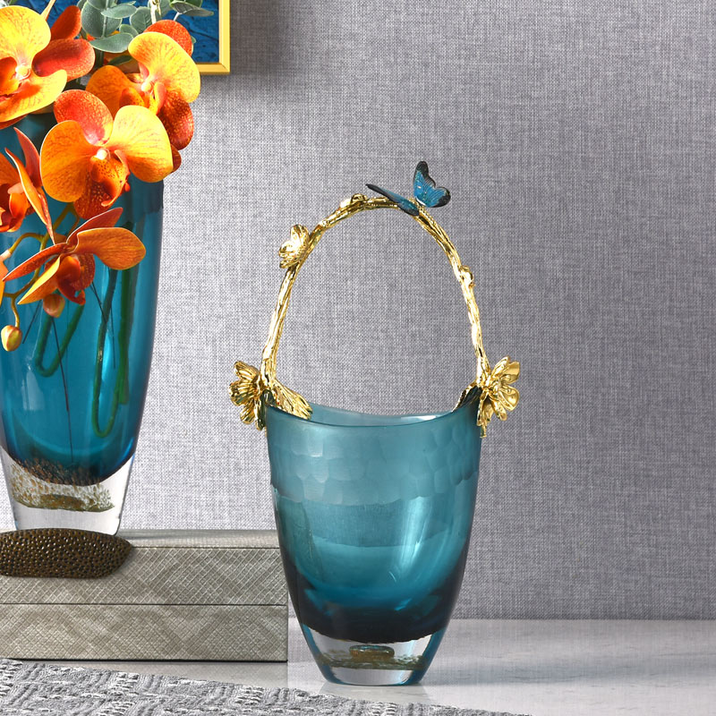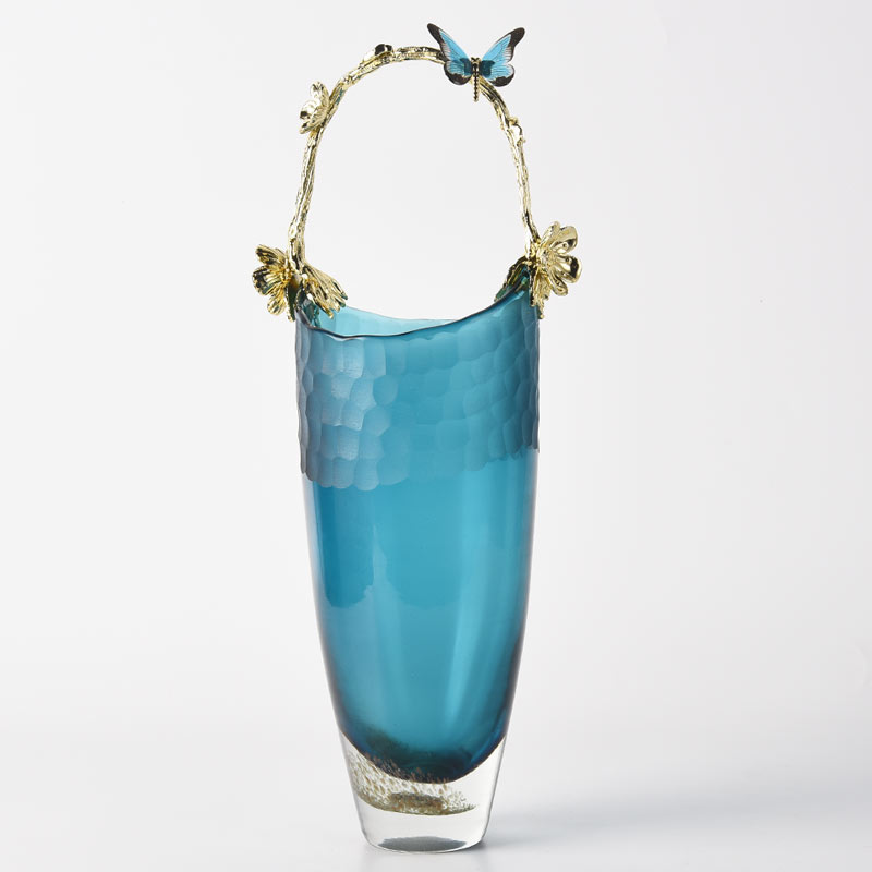 Бакара стаклена вазна декорација со ириси и пеперутки